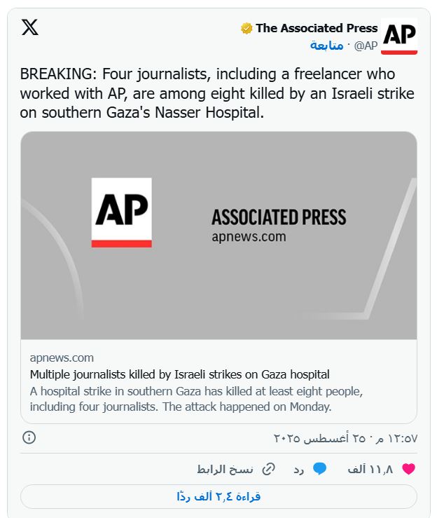 لكن خطوة الوكالة جاءت بعد موجة غضب وانتقادات لاذعة اجتاحت منصات التواصل الاجتماعي، إثر تجاهلها ذكر اسم الصحفية في خبرها العاجل الذي بثّته على منصة "إكس"، مكتفية بالإشارة إليها بأنها "صحفية مستقلة عملت مع الوكالة"، رغم أنها قُتلت برفقة زملائها أثناء الاستهداف المباشر لمستشفى ناصر.