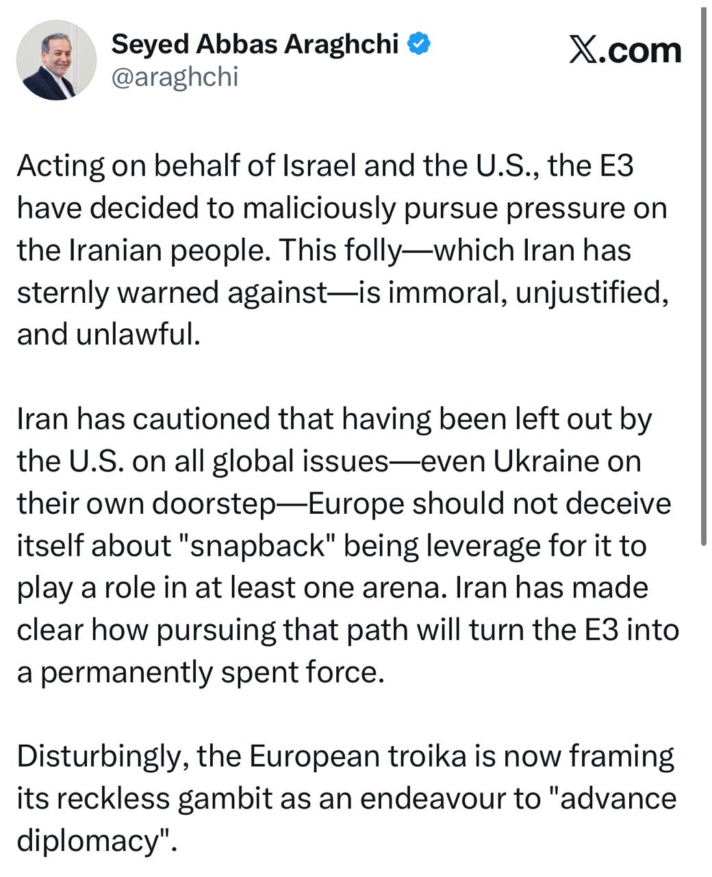 وردا على بدء تنفيذ آلية سناب باك من قبل الترويكا الأوروبية؛ كتب وزير الخارجية الايرانية، عباس عراقجي، عبر منصة اكس: قررت الترويكا الأوروبية، نيابة عن الكيان الإسرائيلي والولايات المتحدة، اتباع نهجٍ متحيز للضغط على الشعب الإيراني. هذه الخطوة غير المدروسة التي حذّرت منها إيران بشدة غير أخلاقية وغير مبررة وغير قانونية.