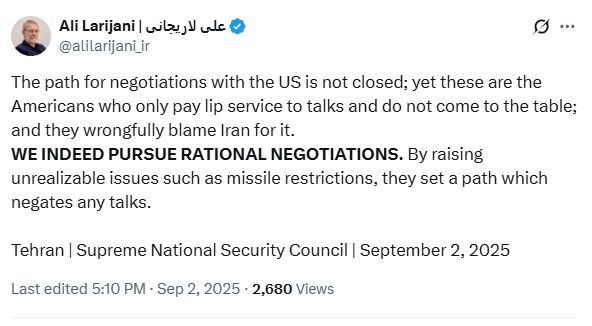 وكتب لاريجاني عبر حسابه على موقع اكس: "مسار المفاوضات مع الأمريكيين ليس مسدودا لكنهم يتحدثون فقط في الكلام، ولا يأتون لطاولة التفاوض".