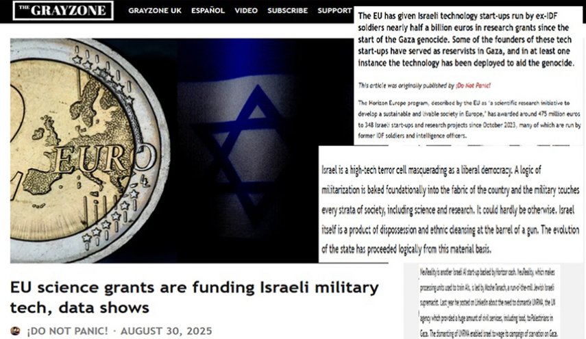 الاتحاد الأوروبي يمول شركات عسكرية صهيونية بنصف مليار يورو كشف موقع "ذا جراي زون" أن الاتحاد الأوروبي قدم لشركات التكنولوجيا الصهيونية، والتي يديرها جنود وضباط سابقون في جيش الکیان الصهيوني، ما يقارب نصف مليار يورو من المنح البحثية منذ بداية الإبادة في غزة.