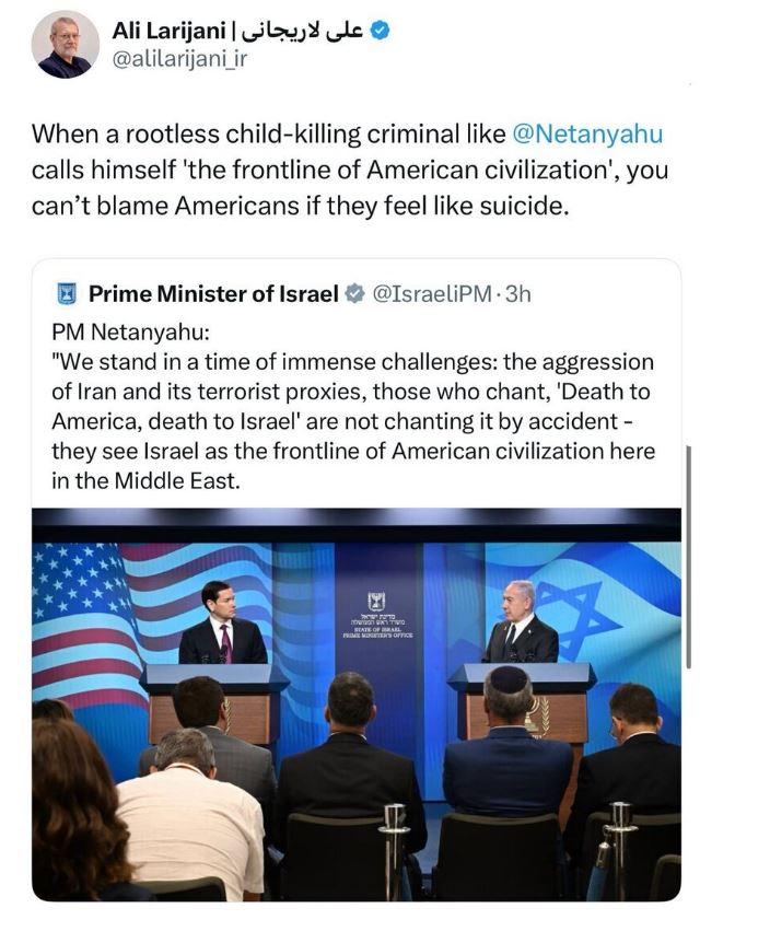 وعلق لاريجاني، على تصريحات رئيس وزراء الكيان الصهيوني بنيامين نتنياهو، وكتب عبر منصة "إكس":