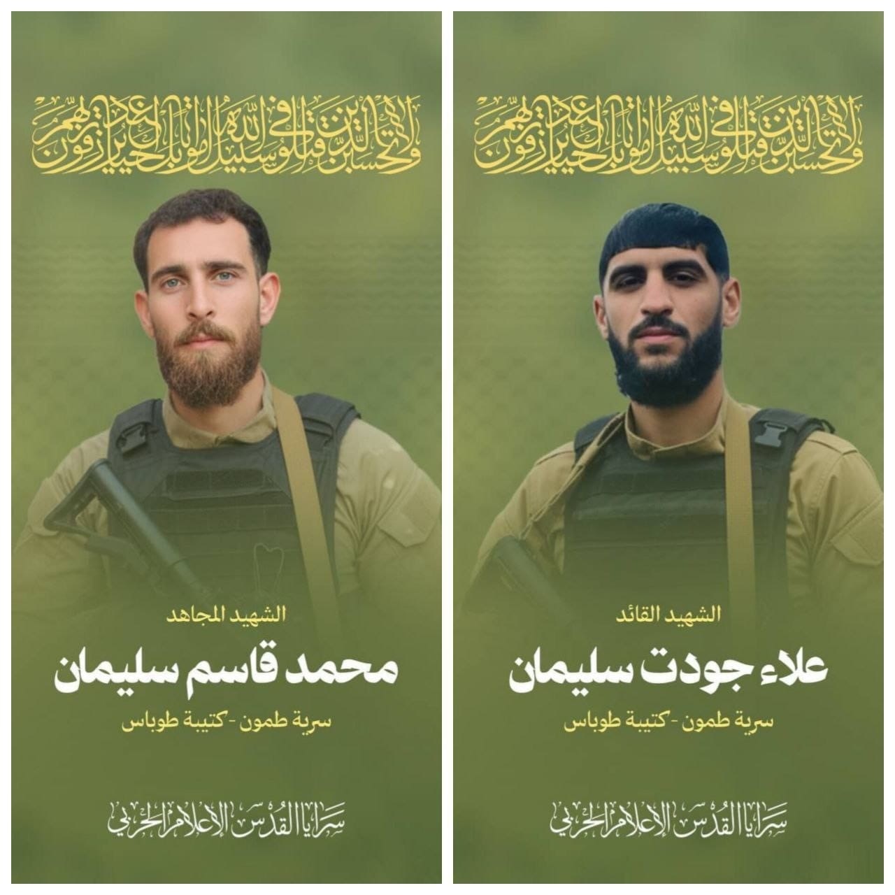 وقالت السرايا في بيان صحفي: نزف الشهيد القائد علاء جودت سليمان، والشهيد المجاهد محمد قاسم سليمان ، من مجاهدي سرية طمون كتيبة طوباس ، اللذين ارتقيا إلى العلا صباح اليوم بعد خوضهما اشتباكا مسلحا لعدة ساعات مع قوات العدو ، التي حاصرتهما بمنزل في بلدة طمون شمالي الضفة الغربية المحتلة.