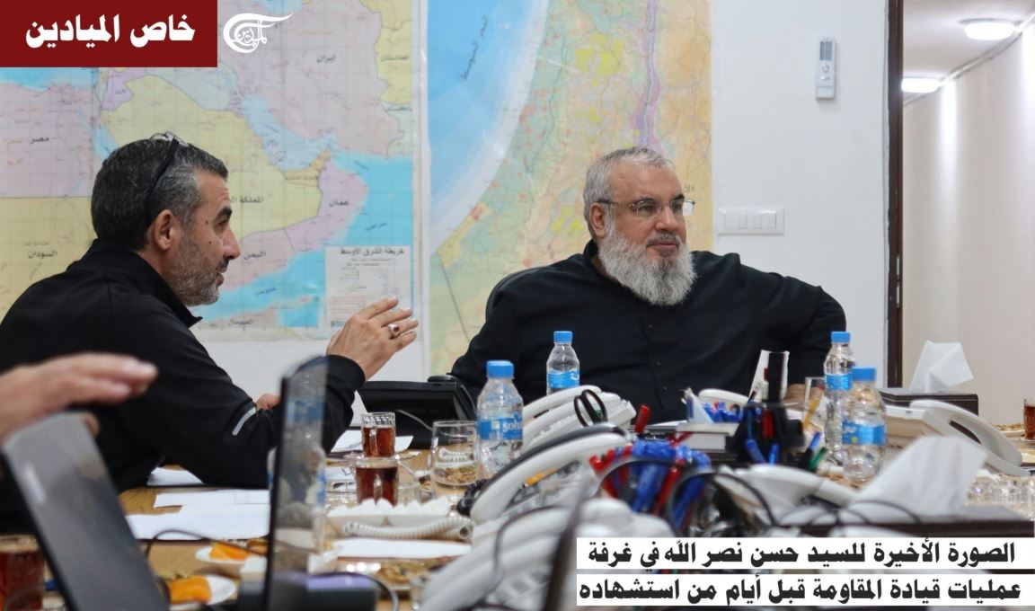 ونشرت قناة الميادين آخر صورة للشهيد نصر الله، التُقطت داخل غرفة عمليات قيادة المقاومة قبل أيام قليلة من استشهاده، وإلى جانبه أمين سر المجلس الجهادي الشهيد القائد محمد حبيب خير الدين (الحاج حسن).