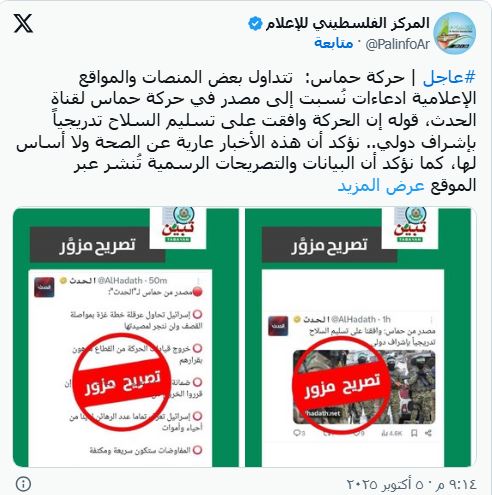 وقال القيادي بالحركة محمود مرداوي في تصريح صحفي : إنه لا صحة للادعاءات المفبركة التي نشرتها إحدى القنوات الفضائية وعدد من وسائل الإعلام حول مسار مفاوضات وقف إطلاق النار وموقف الحركة من تسليم السلاح.
