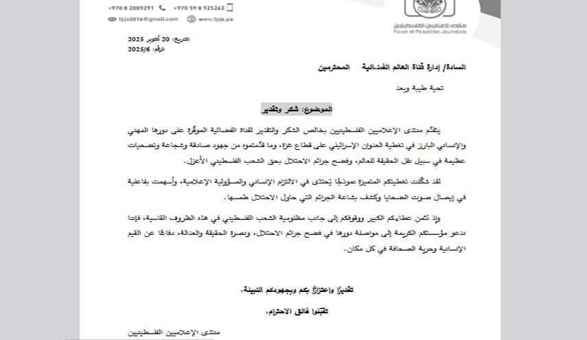 وجاء في نص الرسالة، الصادرة بتاريخ 20 أكتوبر 2025، أن المنتدى يتقدّم بخالص الشكر والتقدير لإدارة قناة العالم على جهودها الصادقة والشجاعة وتضحياتها العظيمة في سبيل فضح جرائم الاحتلال بحق الشعب الفلسطيني الأعزل، مؤكدًا أن تغطية القناة شكّلت نموذجًا يُحتذى في الالتزام الإنساني والمسؤولية الإعلامية.