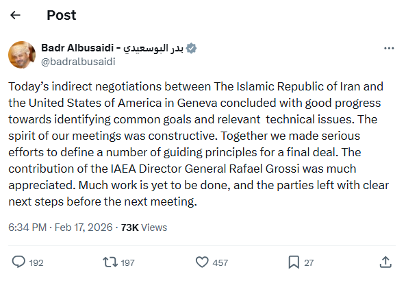 وكتب وزير الخارجية العماني في حسابه على منصة "إكس": "اختُتمت اليوم المفاوضات غير المباشرة بين الجمهورية الإسلامية الإيرانية والولايات المتحدة الأمريكية في جنيف، مُحرزةً تقدماً جيداً نحو تحديد الأهداف المشتركة والقضايا الفنية ذات الصلة".
