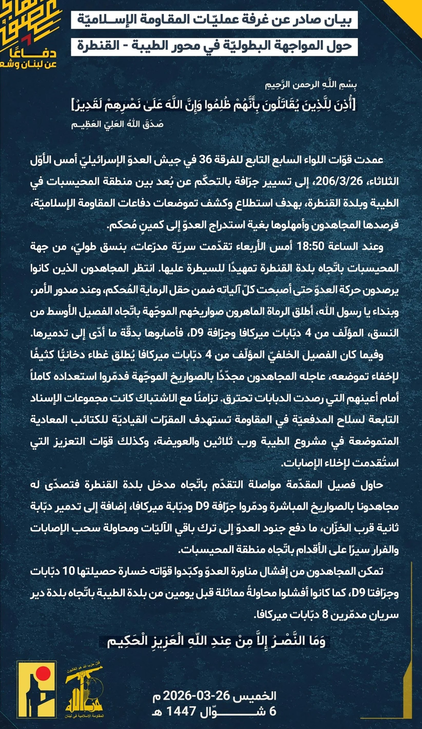 وأوضح البيان أن قوات من اللواء السابع التابع للفرقة 36 في جيش الإحتلال اللقيط دفعت، قبل يومين، جرّافة تعمل بالتحكم عن بُعد بين منطقة المحيسبات في الطيبة وبلدة القنطرة بهدف استطلاع مواقع دفاعات المقاومة. وأشار إلى أن المقاتلين رصدوا التحرك وأبقوا الجرّافة تحت المراقبة بهدف استدراج القوات الإسرائيلية إلى كمين محكم.